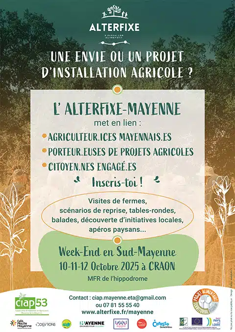 Après les rencontres à Montflours et à Grazay, Alterfixe va réunir les porteurs et porteuses de projet à la MFR de l’Hippodrome à Craon. Au cours de ce week-end, nous allons découvrir le territoire du sud de la Mayenne, visiter les fermes, réfléchir à leur transmission et aux scénarios de diversifications possibles, et…passer de bons moments ensemble !