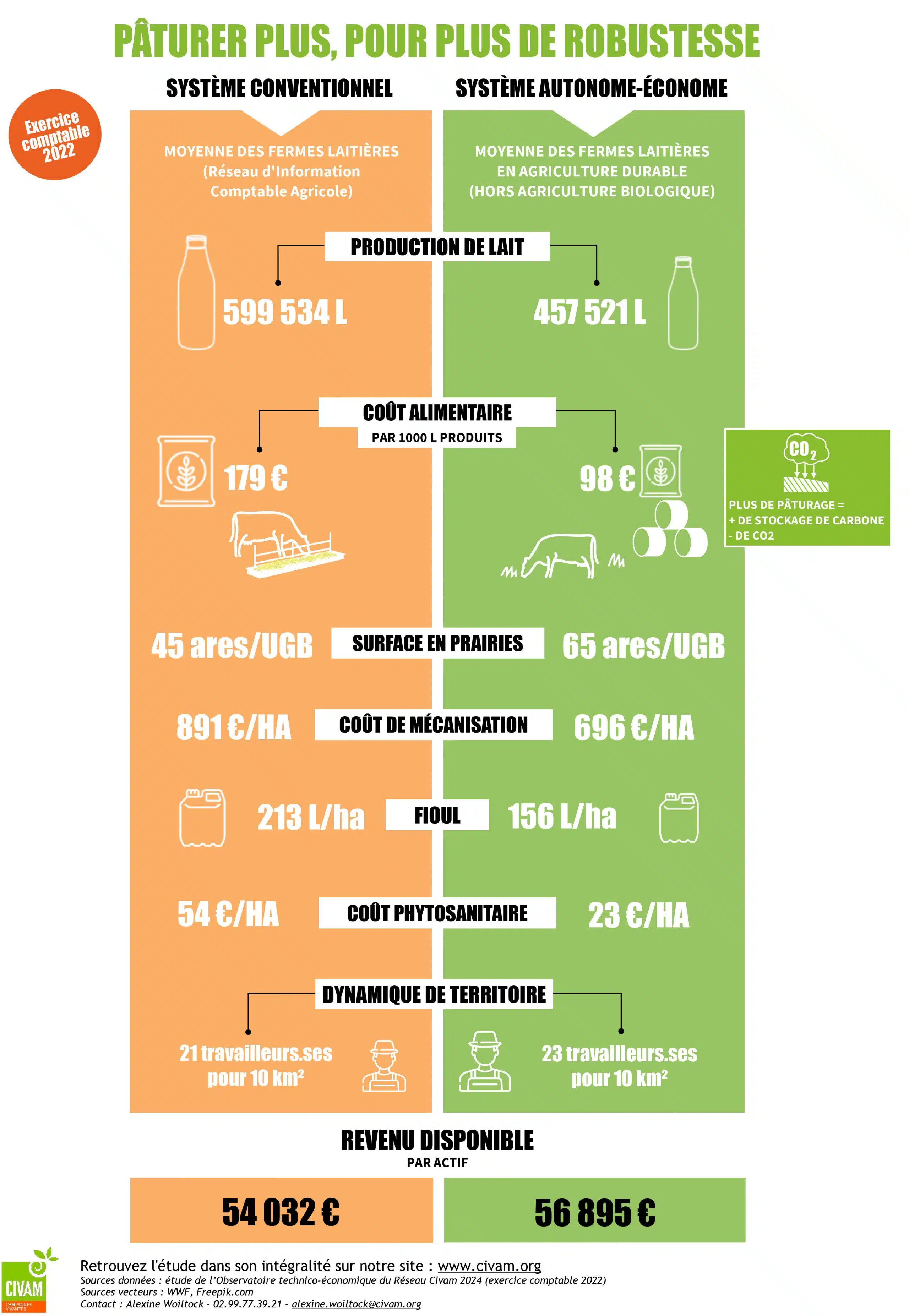L’année 2022 est marquée par une hausse significative du prix du lait conventionnel, atteignant 469 €/1000 L (+ 17 % par rapport à 20212). Pour tenter d’en profiter, les fermes RICA cherchent à produire plus, quitte à produire du lait qui coûte cher en intensifiant les achats d’aliments et d’intrants extérieurs, ou encore en augmentant leur cheptel. En 2022, leurs charges augmentent ainsi en moyenne de 56 €/1000 L, soit + 11 %. Cette réactivité aux fluctuations de prix fragilise les systèmes RICA. Le prix du lait a augmenté mais qu’en sera-t-il en cas de crise du lait comme nous avons pu vivre par le passé ? Les fermes en agriculture durable (AD) des Civam ne suivant pas cette stratégie volume, leurs charges restent relativement stables. Des charges qui sont déjà moindres dans ces systèmes économes qui maximisent le pâturage et qui réduisent leur utilisation d’intrants tels que les aliments ou les engrais et produits phytosanitaires sur les cultures. Au bilan, c’est 120 000€ de charges totales en moins dans les fermes AD grâce à leurs pratiques économes et autonomes. Ainsi malgré une production de lait plus faible, les fermes Civam obtiennent un revenu disponible similaire aux fermes du RICA. En moyenne sur 10 ans, ces fermes génèrent même un revenu disponible supérieur de près 6 600 € par rapport aux fermes RICA3.