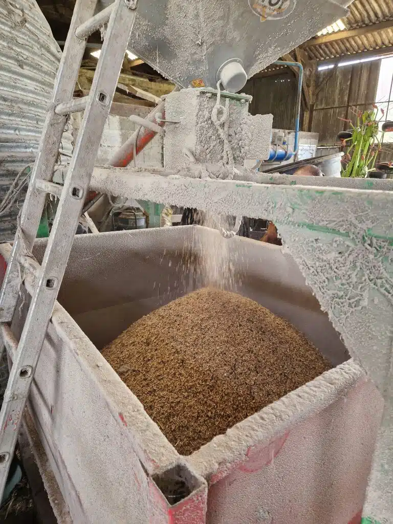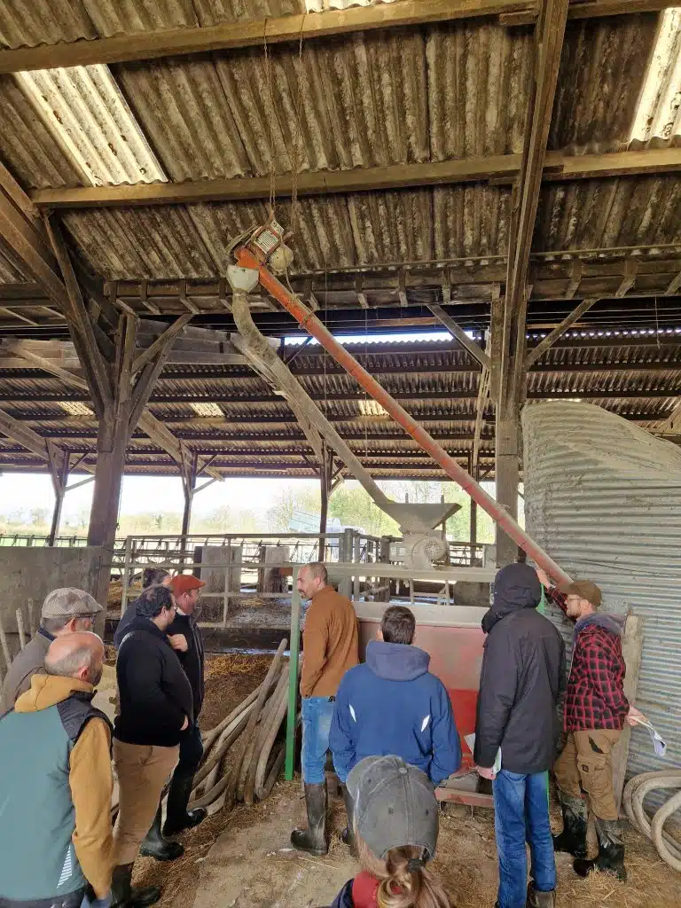 La visite s’est poursuivie dans le bâtiment d’élevage avec la présentation de l’organisation du stockage et de la distribution des céréales, notamment grâce à un aplatisseur à grain relié à la cellule et à une trémie mobile, ce qui facilite le travail et fait gagner du temps à Laurent et Solène, sa salariée.