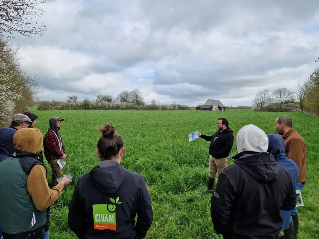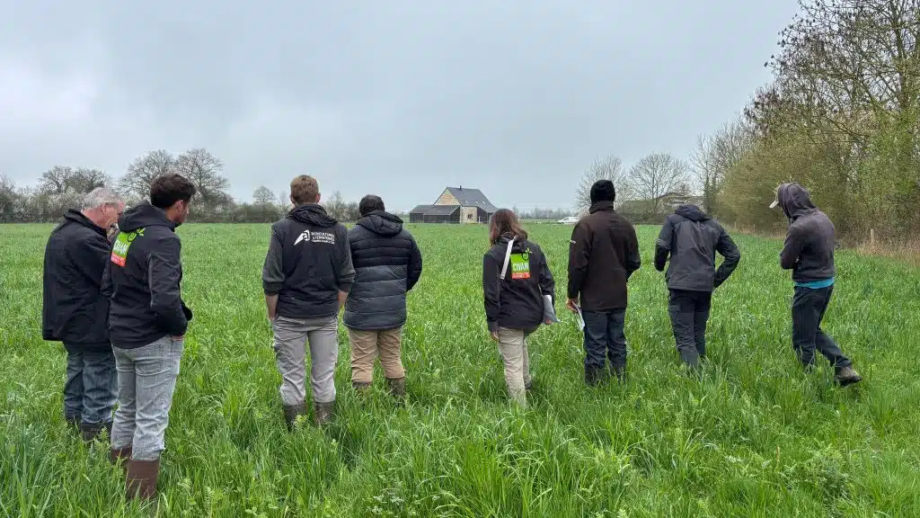 La matinée a débuté par la visite d’une prairie implantée sous couvert de méteil, une technique favorisant une bonne implantation des prairies et limitant les adventices.